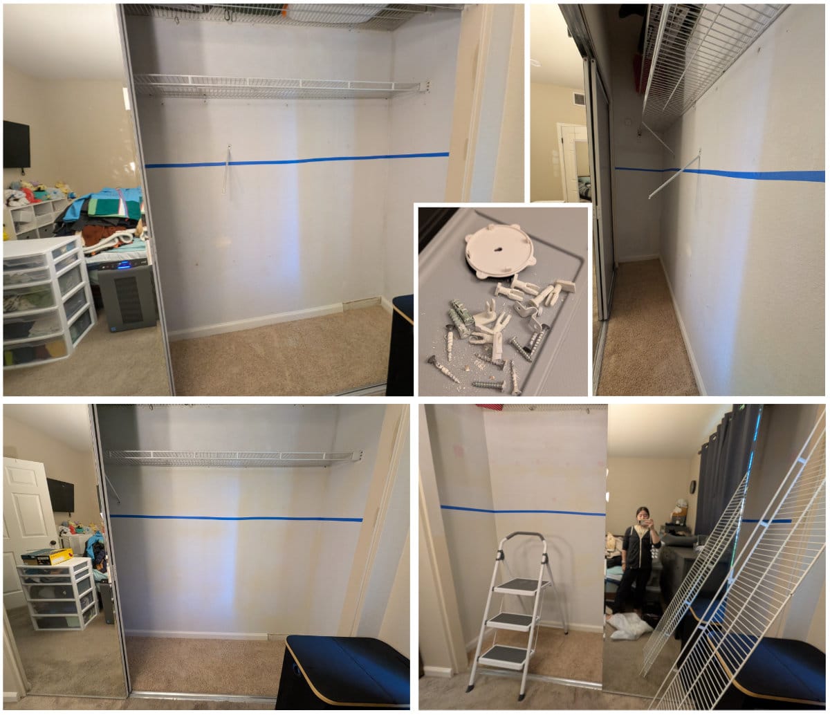 I also took everything out of the closet to patch the holes and test some measurements. I just had piles of clothes on the bed (and eventually piles of clothes in the office when I actually took down the old shelf/rod).