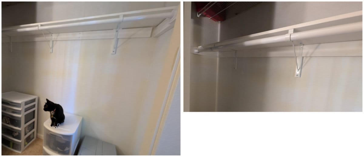 And I am so happy I can slide my hangers on the rod so much easier than before and I can make enough room to grab something off a hanger without knocking off adjacent items! I also made the shelf/rod about 1-2 inches lower than it was before, so my vertically challenged self does not have to struggle as much. Because why should I have to struggle in my own home.