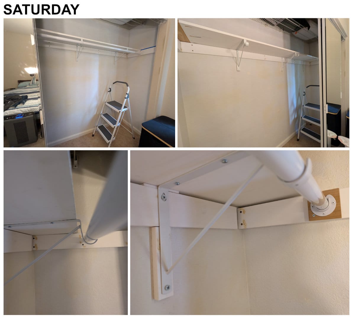 I think I still had a few screws to drive into the back panel. Then I tested the bracket positioning and if the shelf (I lifted it by myself this time hehe) and rod would sit correctly on them. It seemed like they would...