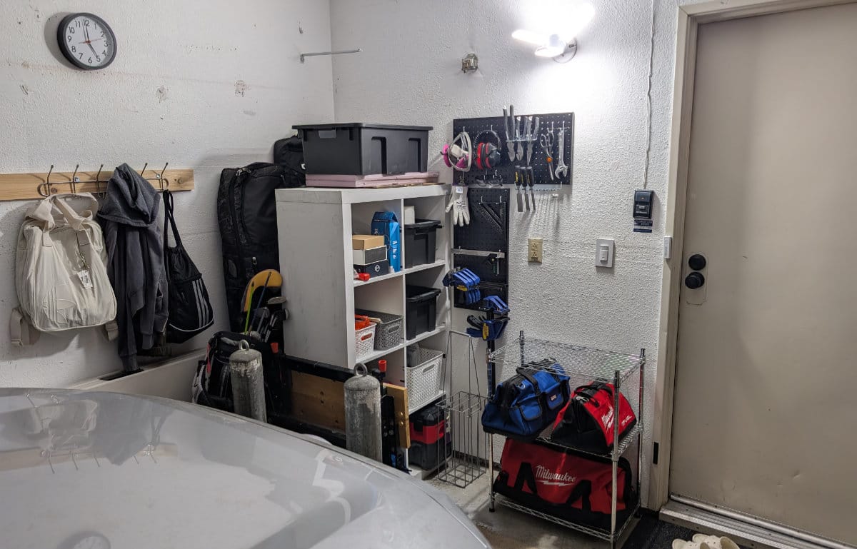 I think the wire shelf makes the area feel more open because you can see through it. The snowboard bags are also hidden behind the 2x4 shelf. And all cubbies on the 2x4 shelf are accessible now. Previously most of the cubbies were blocked by the folding workbench, so I had to move the workbench anytime I wanted to find something.