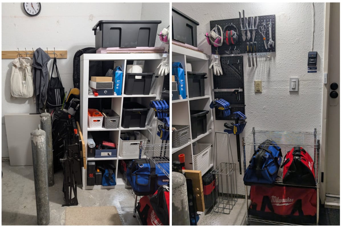 Before the reorganization, I had a 2x4 cube shelf horizontal and parallel to the wall. The shelf was left in the garage when I bought the house. I liked having it next to the door so I could set things down to open the door.