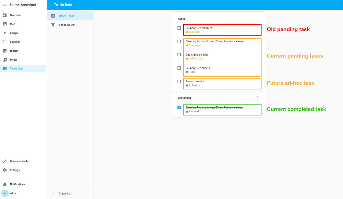 Current completed tasks continue to be displayed to boost morale ("wow look at all the chores I did this week!") and increase awareness for both residents of the household (if a task was done, the other person can see that it was done). I would also like a way to show old pending tasks that were completed this week for both of those reasons, but I'm not sure how I want to accomplish this yet.