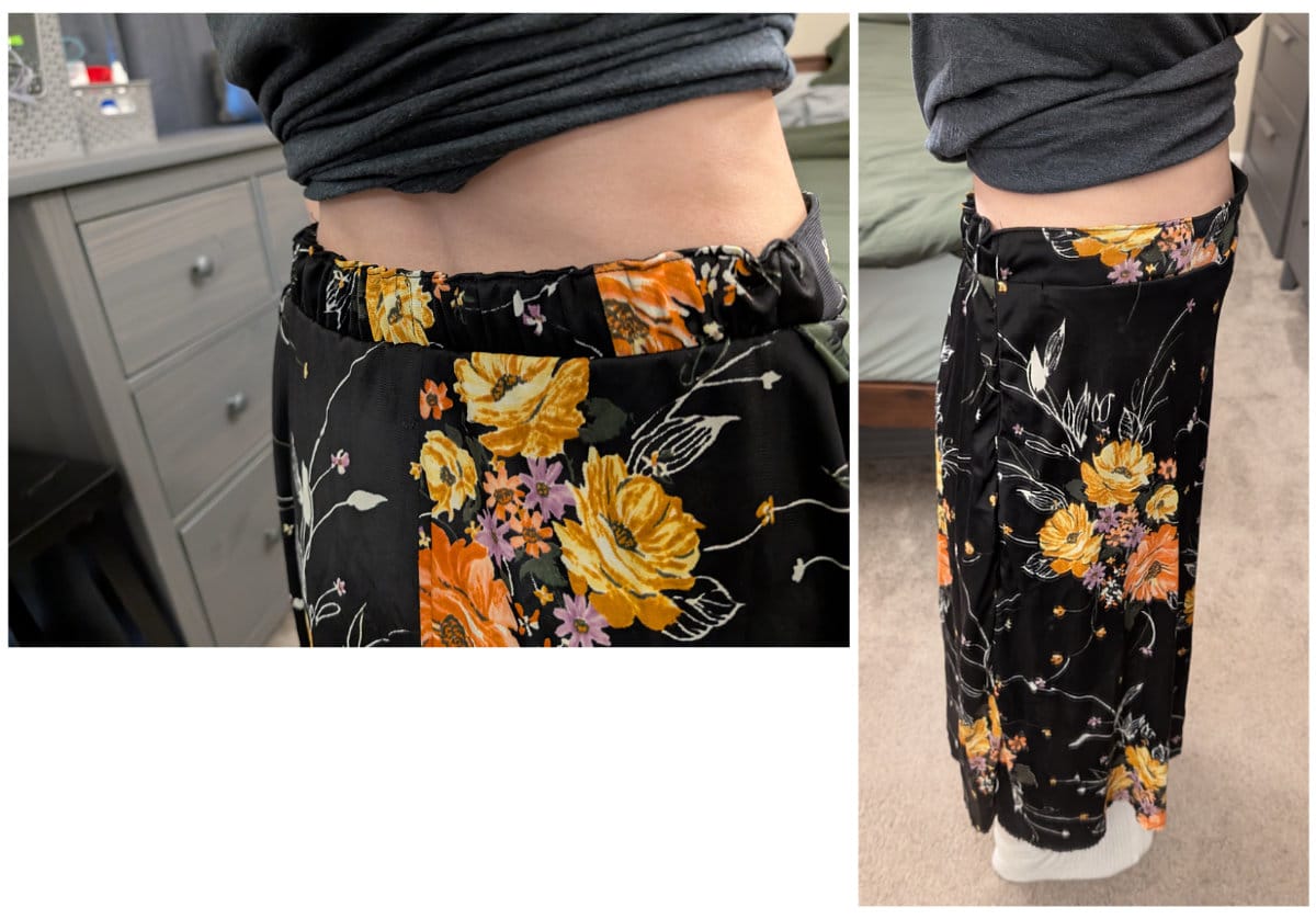I left the shape of the skirt intact from last time. But I cut off the portion that was going to be the waistband to construct the waistband separately. The fabric is rather delicate, so I decided to back it with a more structured fabric. I had some leftover cotton quilting fabric I bought in 2020 to make reusable face masks, so I tried that. It might've been okay actually, but I made the mistake of using two layers. My vision was to have the waistband be primarily made from this fabric, and have the delicate floral fabric as a top layer for aesthetic. But it ended up being pretty thick. And I don't think I used the correct stitches so it was extra stiff.