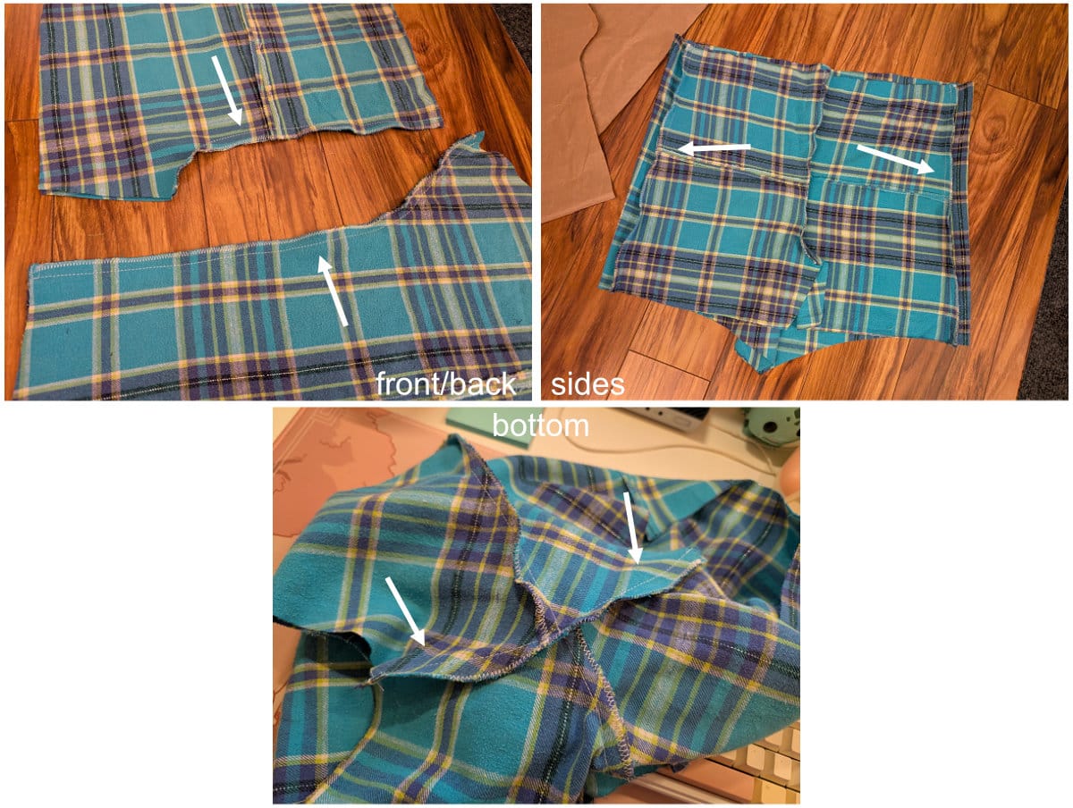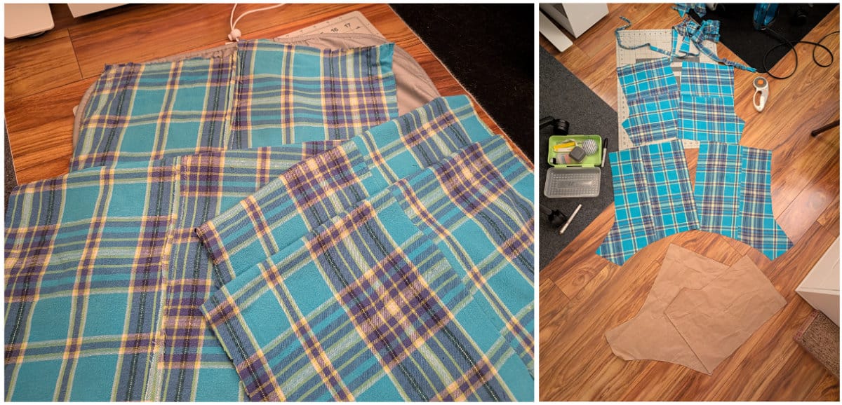 I had cut the pants in half on the side seams (I just cut off the seams instead of ripping it apart). I realized I couldn't use it like that because the front/back seams weren't flat. I was going to scrap the plan. But the next day, I realized I could cut those seams too and join the pieces back together into a flat rectangle.