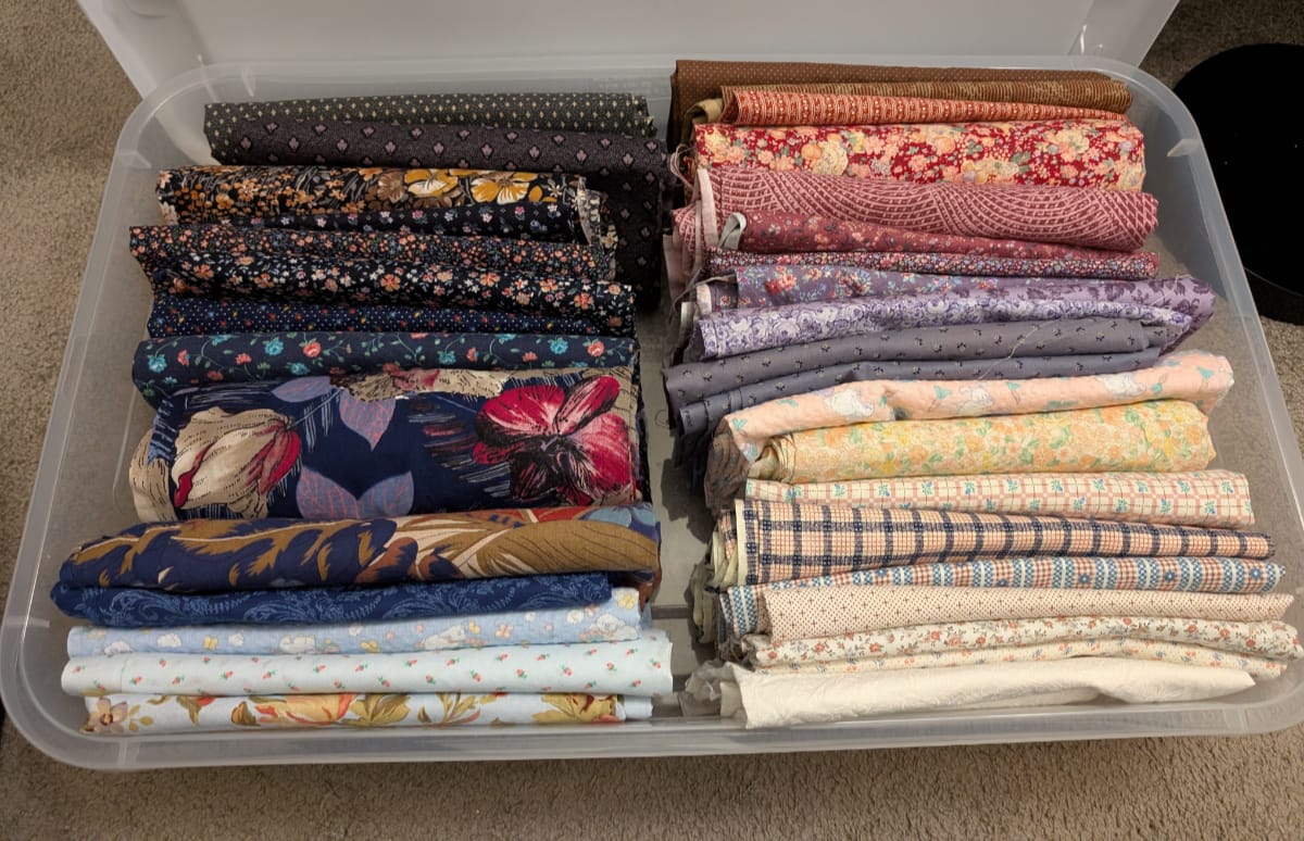 At this point, I had fabrics from various mystery bundles (online and from Facebook marketplace) and a few individually selected fabrics. They have filled two plastic bins under my bed.