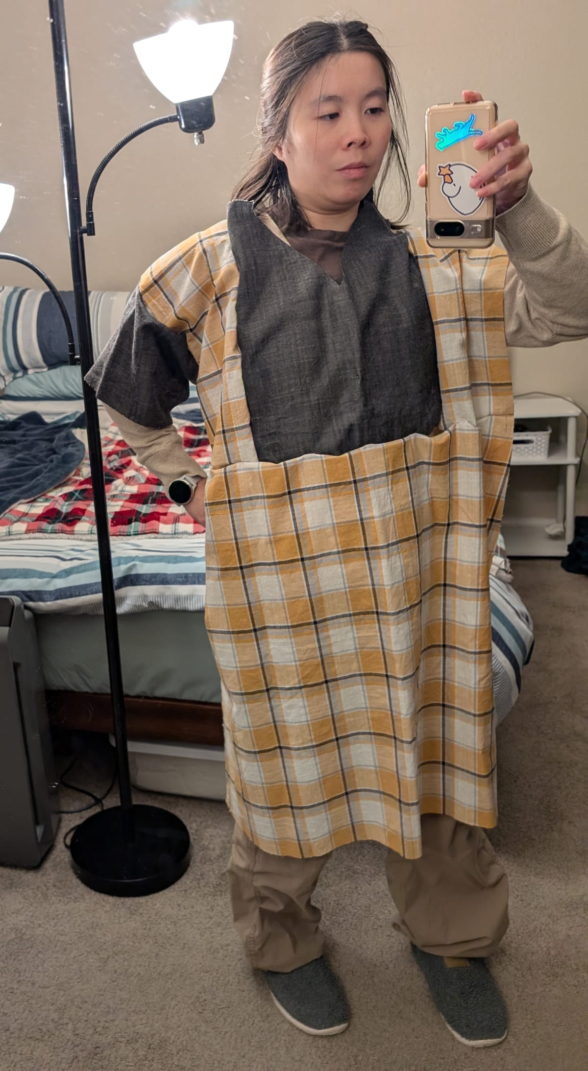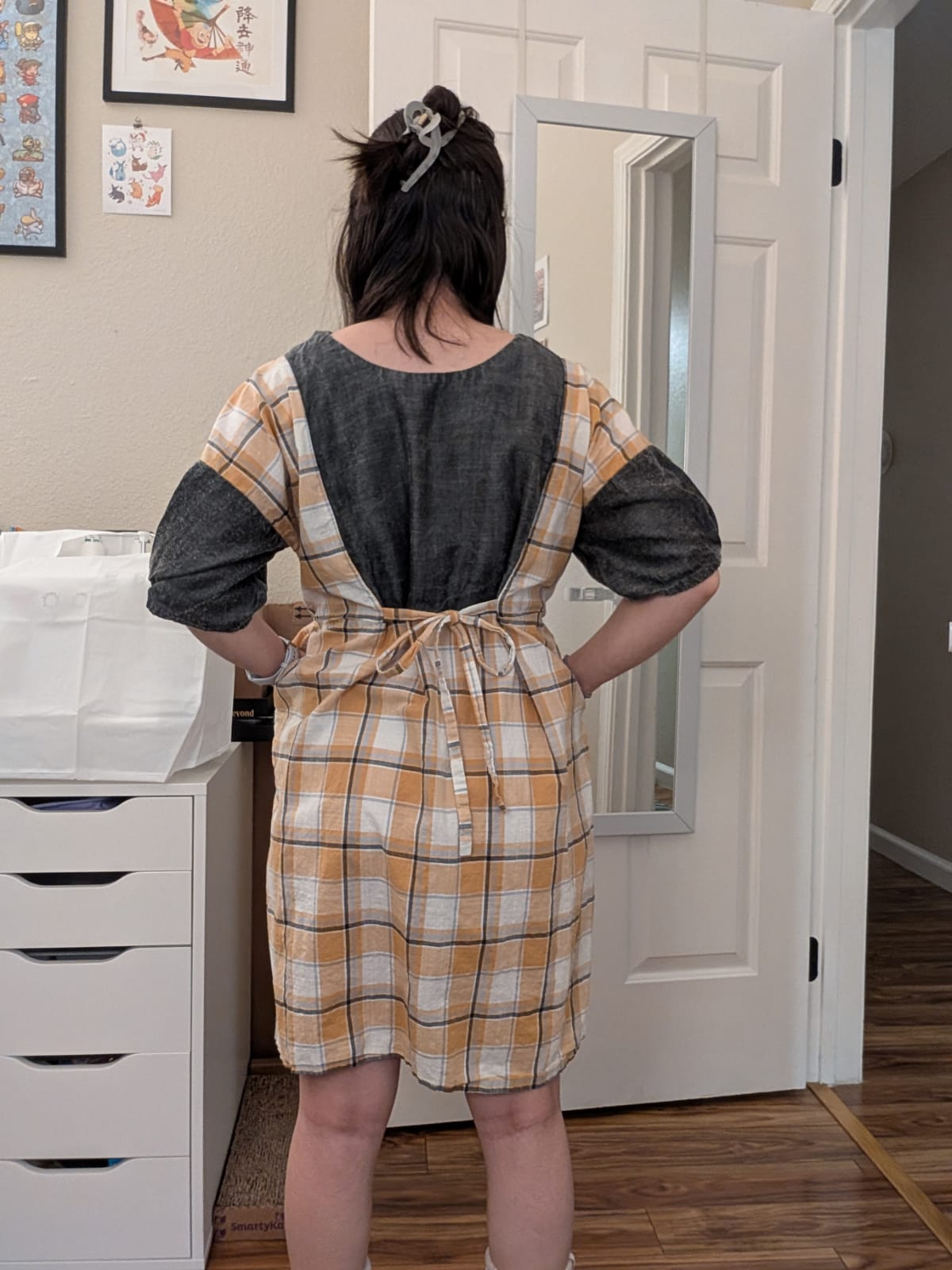 I consulted both a friend and my partner at separate times about which two fabrics would pair well together. In the end, I decided on a gray chambray and yellow plaid. (Yes, another yellow plaid.) Both of them are from Fabric Mart. Honestly, I might have gotten the yellow plaid to make another tie dress, but I don't remember anymore. And the gray chambray, I originally bought to make the Sewing Therapy ele skirt. (I probably have enough fabric to make a skirt still, since I used less than a yard.)