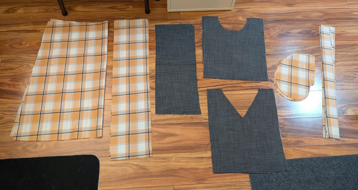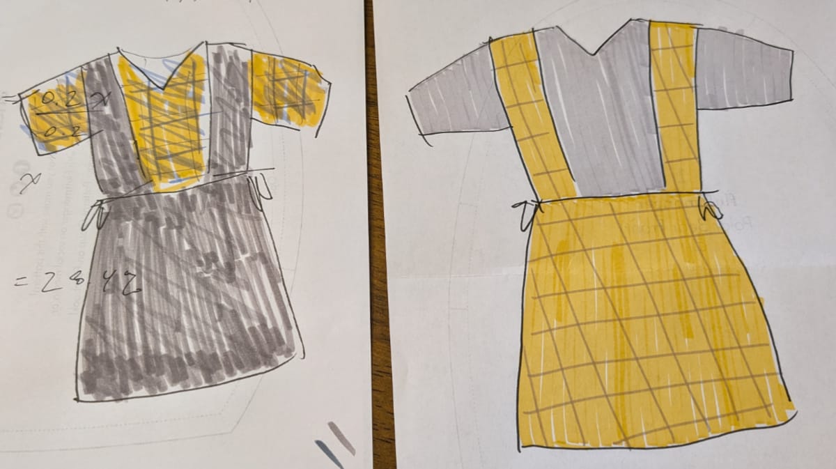 I wanted to use two different fabrics to create more visual interest. The tie dress pattern already has separate pieces for the main bodice, the sides of the bodice, the sleeves, and the skirt. I also had a vision of making a dress that looked like a pinafore over a shirt but was actually a single piece. So I would have the main bodice and sleeves be the "shirt", and the sides and skirt be the "pinafore".